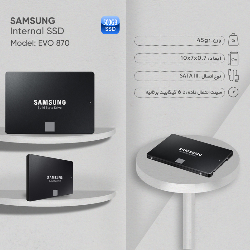 نگهداری اطلاعات دیجیتال همواره یکی از موضوعاتی است که امروزه همگی ما با آن درگیر هستیم به همین خاطر لازم است تا همیشه یک وسیله مانند هارد، رم یا فلش مموری همراه خود داشته باشیم تا اطلاعات مورد نظر خود را جابه‌جا کنیم. به همین دلیل است که در سال‌های اخیر استفاده از حافظه‌های جامد اس اس دی اینترنال در کامپیوترها بسیار داغ شده است. حافظه‌های اس اس دی دارای قطعات ثابتی هستند که از چندین منظر کار کاربران را برای استفاده و حمل‌ونقل راحت می‌کند. اس اس دی اینترنال مدل EVO 870 با ظرفیت 500 گیگابایت محصولی از شرکت خوش‌نام سامسونگ است که در برابر لرزش مقاومت زیادی دارد و به این راحتی‌ها خراب نمی‌شود. به همین دلیل میانگین عمر این محصول 1.5 میلیون ساعت است که تقریباً باید آن را بی‌نظیر خطاب کرد. همچنین این حافظه که 500 گیگابایت ظرفیت دارد، دارای وزن 45 کیلوگرم بوده و از طریق رابط SATA 2.5 به دستگاه شما متصل می‌شود.