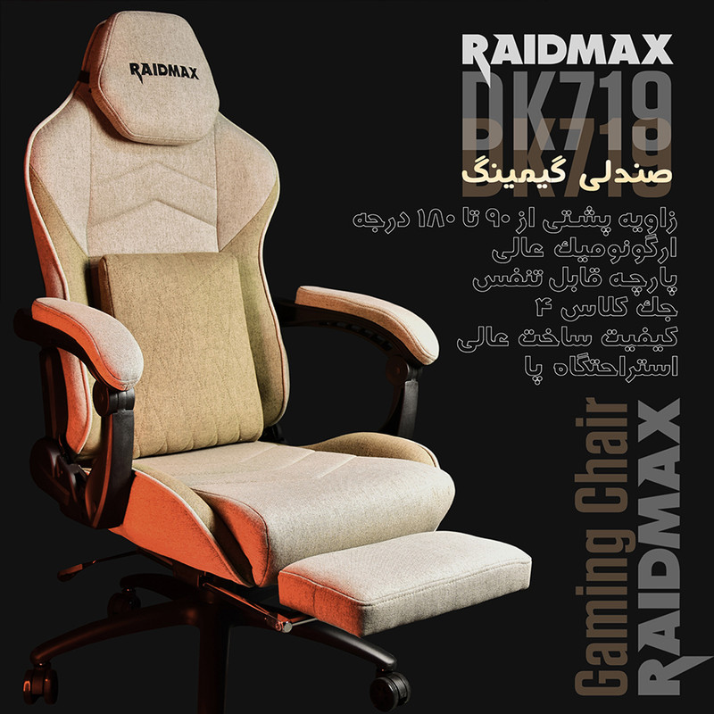 صندلی های گیمینگ به طور معمول دارای جنس چرم مصنوعی PU روی بدنه هستند که برای برخی از کاربران خوشایند نیستند. از این رو شرکت ریدمکس در کنار تولید محصولات دارای بدنه چرم مصنوعی، مدل هایی خاص مانند صندلی گیمینگ DK 719 را با پارچه نرم قابل تنفس تولید می کند. کاربرانی که در مناطق مرطوب سکونت دارند، در فصول گرم سال با مشکل تعریق و چسبیدن لباس به چرم مصنوعی مواجه می شوند که این موارد در صندلی های پارچه ای مشاهده نمی شود. از سوی دیگر، جنس پارچه ای بدنه می تواند احساس خوشایند یک مبل راحتی را منتقل کند و تجربه خوشایند استفاده طولانی مدت را ارائه می دهد. صندلی مخصوص بازی RAIDMAX DK 719 یکی از خاص ترین و لوکس ترین تولیدات این کمپانی خوشنام به شمار می رود که ویژگی های فنی قابل توجهی دارد. سبک طراحی آن با تلفیقی از صندلی های گیمینگ و مبلمان راحتی صورت گرفته و در کنار ظاهر جذاب خود، راحتی شگفت انگیزی را به ارمغان می آورد. براگیر های دو قسمت پشتی و نشیمن گاه بر اساس اصول استاندارد ارگونومی انجام شده تا نهایت آرامش را به کاربران منتقل سازد. درجه سختی فوم مورد استفاده توسط ریدمکس در ساخت نشیمن گاه و پشتی صندلی در سطح متوسط ارزیابی می شود. از این رو احساس فرو رفتگی بدن وجود ندارد و تمام بخش ستون فقرات و پا در نهایت آرامش روی صندلی قرار می گیرد. کمپانی سازنده برای آرامش بیشتر کاربران در شرایط استفاده طولانی مدت، بخش استراحت گاه پا را در نظر گرفته که به سادگی از قسمت زیرین بدنه جدا می شود. بخش استراحت گاه دست نیز توسط لایه ای مستحکم از پارچه نرم قابل تنفس پوشانده شده تا بهترین وضعیت ارگونومی، حتی برای دست فراهم شود. بالشتک مخصوص گودی کمر در مقایسه با سایر محصولات دارای ابعاد بزرگتری بوده و به همین دلیل دارای فرم خاصی است. این فرم خاص می تواند تمامی گودی کمر را به طور کامل تحت پوشش قرار دهد و نهایت آرامش را در استفاده طولانی مدت ارائه دهد.