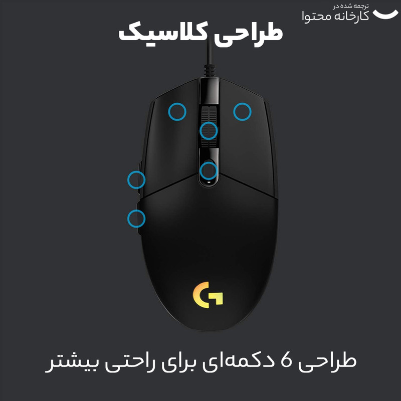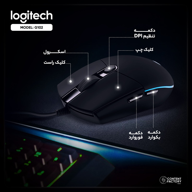 ماوس G102 محصولی از برند «لاجیتک» (Logitech) است. این محصول برای استفاده‌ی علاقه‌مندان به بازی و گیمرها ساخته شده است. بنابراین، دقت بالایی در زمان استفاده دارد؛ به‌طوری‌که، می‌توان دقت آن را بین 200 تا 8000 نقطه بر اینچ تنظیم کرد که میزان بسیار مطلوبی است. ماوس G102 از طریق کابل و USB به کامپیوتر متصل می‌شود و کاربر را در انجام بازی یاری می‌دهد. لاجیتک این ماوس را برای افراد راست‌دست طراحی کرده است. این نکته را می‌توان از شکل قرارگیری و محل قرارگیری کلیدها حدس زد. این ماوس برند لاجیتک دارای کابلی بلند است که در زمان کار با ماوس بسیار کاربردی ظاهر می‌شود. داشتن حافظه داخلی و سرعت پیگیری اطلاعات  1 میلی‌ثانیه ارزش خرید بالایی به این محصول داده‌اند. از دیگر ویژگی‌هایی که باید به آن اشاره کرد عمر بالای قطعات این محصول است. گذشته از این، نورهای RGB هم در این ماوس وجود دارند تا نظر گیمرها را هم بیش از پیش به خود جلب کنند. پس اگر به دنبال ماوسی کاربردی و ارزشمند برای بازی هستید، این ماوس لاجیتک را به عنوان محصولی کاربردی درنظر داشته باشید